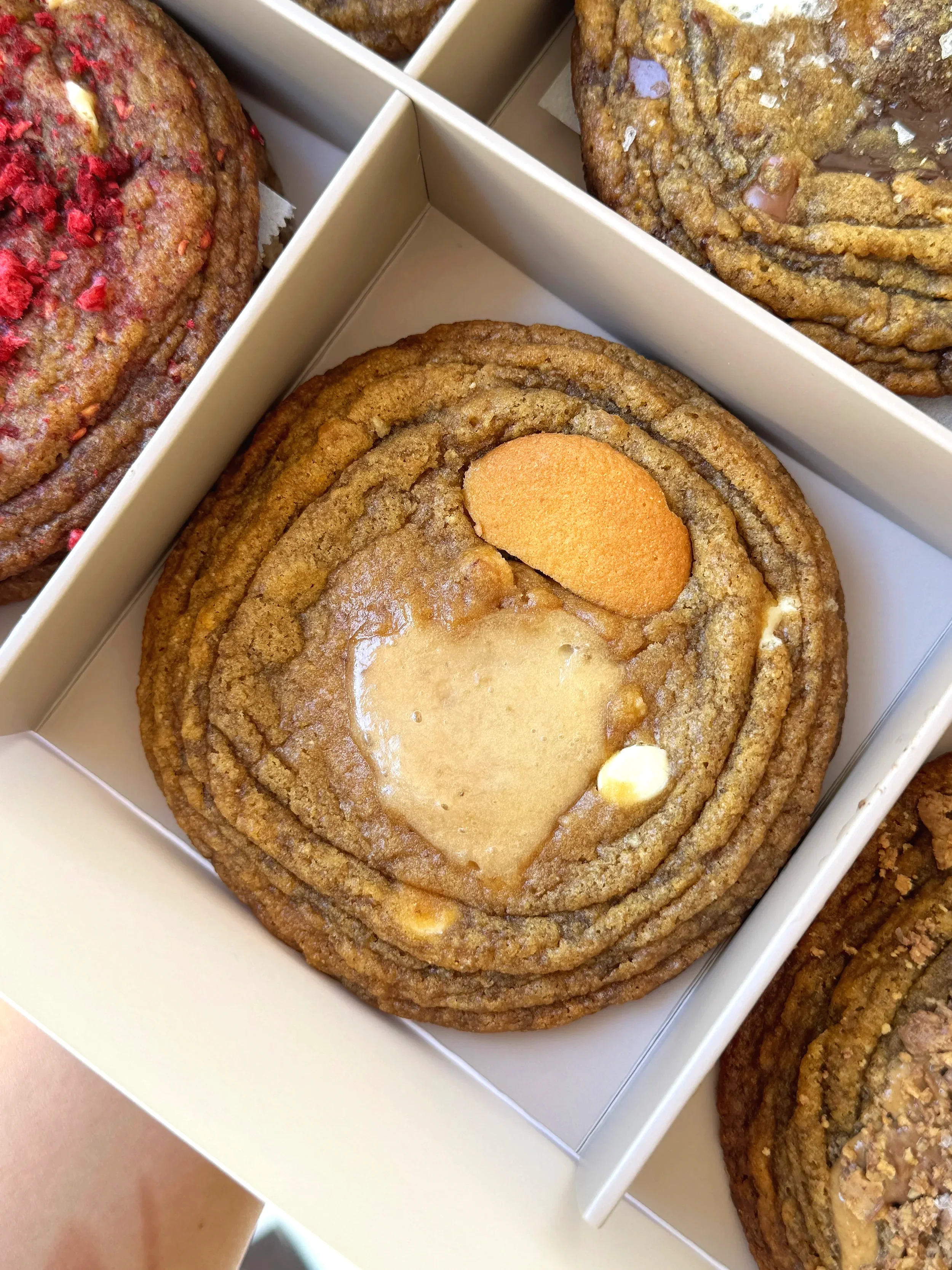 “You guys have to try the Banana Pudding Cookie from Bakerie Marie. It’s giving cozy, sweet, and nostalgic all at once. The texture is insane—crispy edges, soft center, and that little vanilla wafer on top is everything. It tastes exactly like homemade banana pudding but in cookie form. So good.”