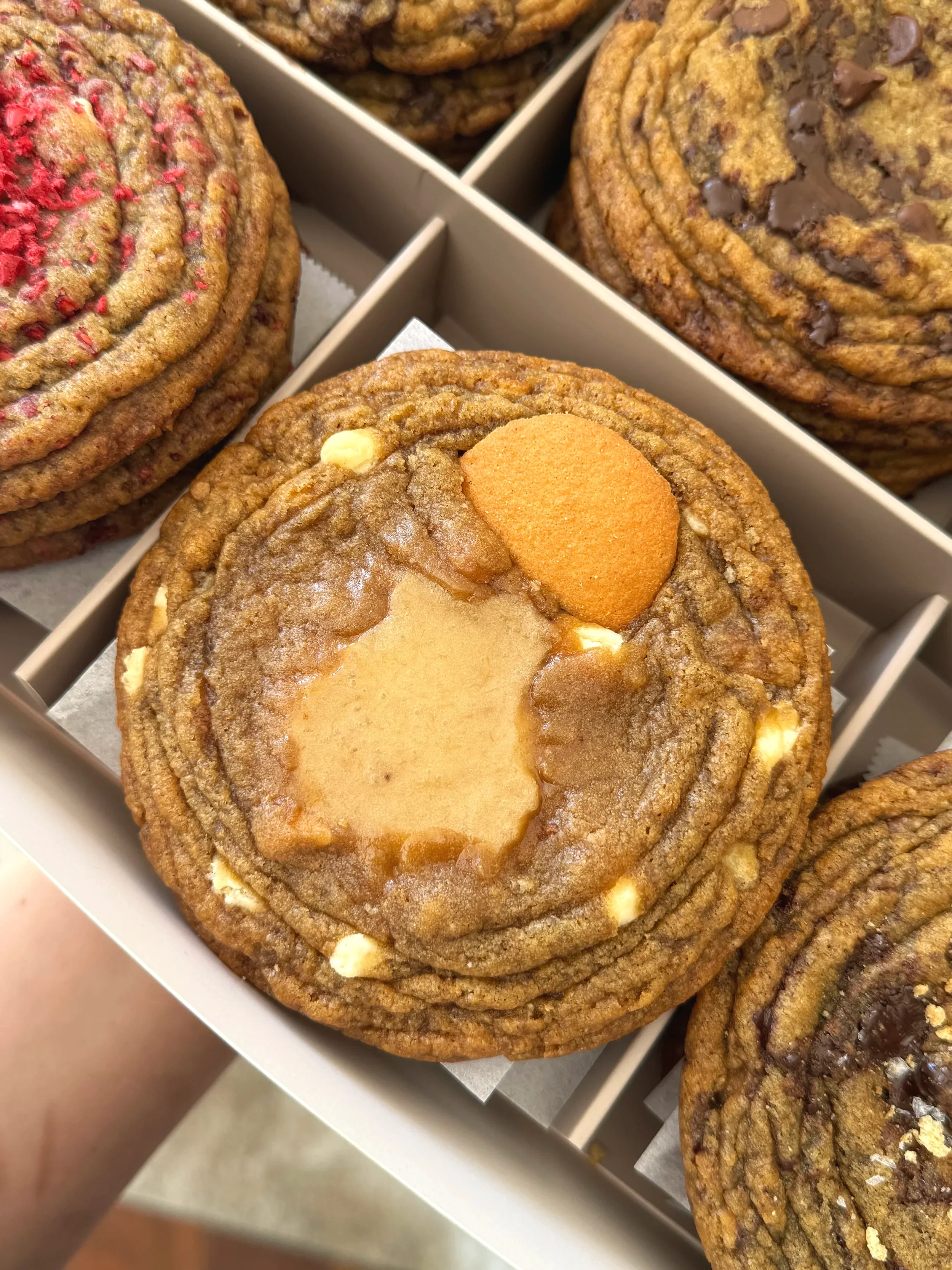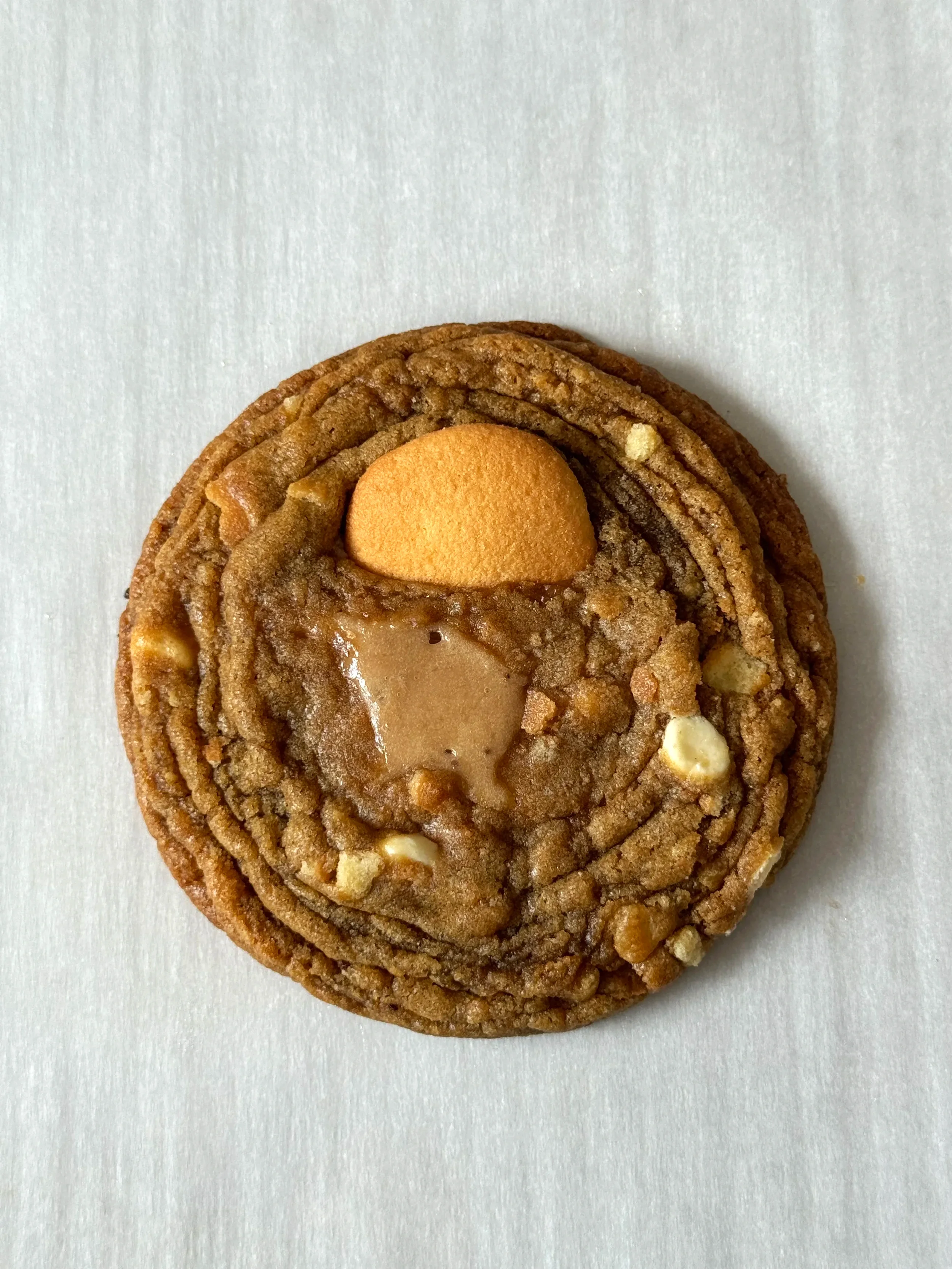Like a banana split went undercover—vanilla cookie dough meets white chocolate, baked around a center of banana cream.